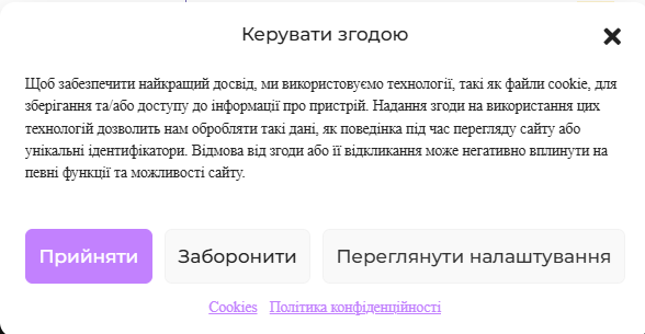 Щоб налаштувати файли cookie, на головній сторінці сайту відкрийте банер “Керування згодою” та надайте дозвіл (натисніть прийняти) або забороніть його(натисніть заборонити). Для більш глибокого налаштування виберіть кнопку “Переглянути налаштування”, вона наддасть змогу виконати більш повне налаштування за бажанням користувача.